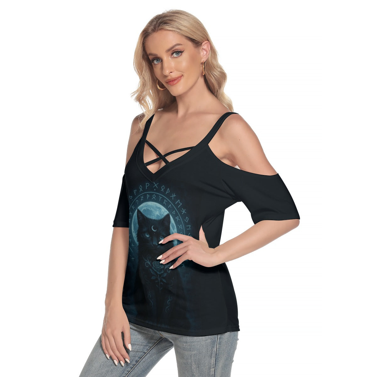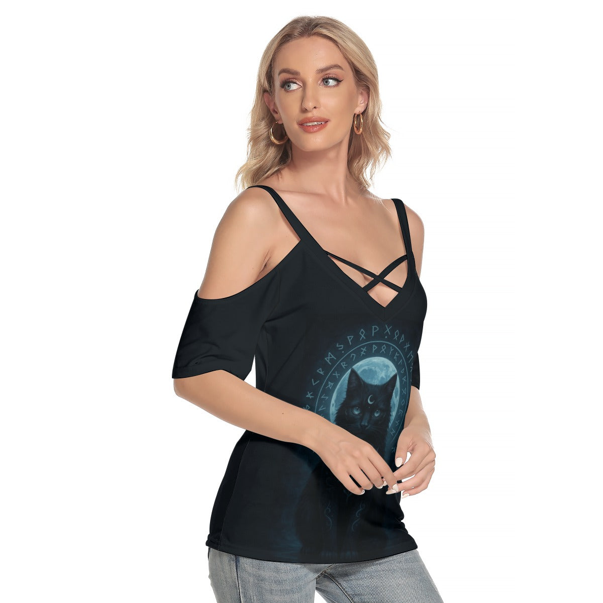 - Details: kalte Schulter, kurzer Ärmel, dünne Träger auf den Schultern, sich kreuzende Bänder auf der Brust