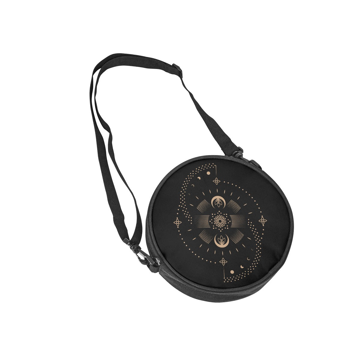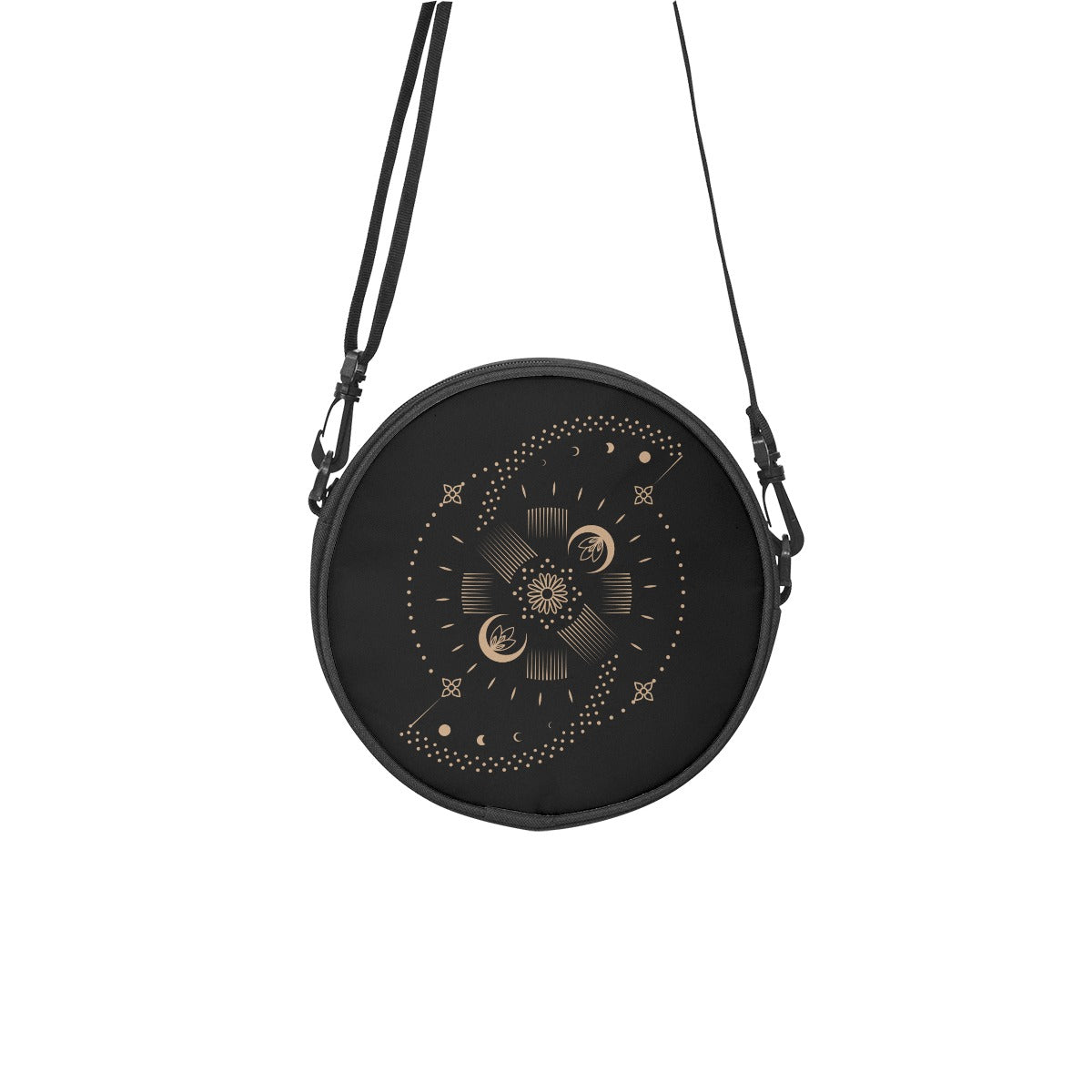 Schwarze runde Tasche mit goldenem Mondsymbol