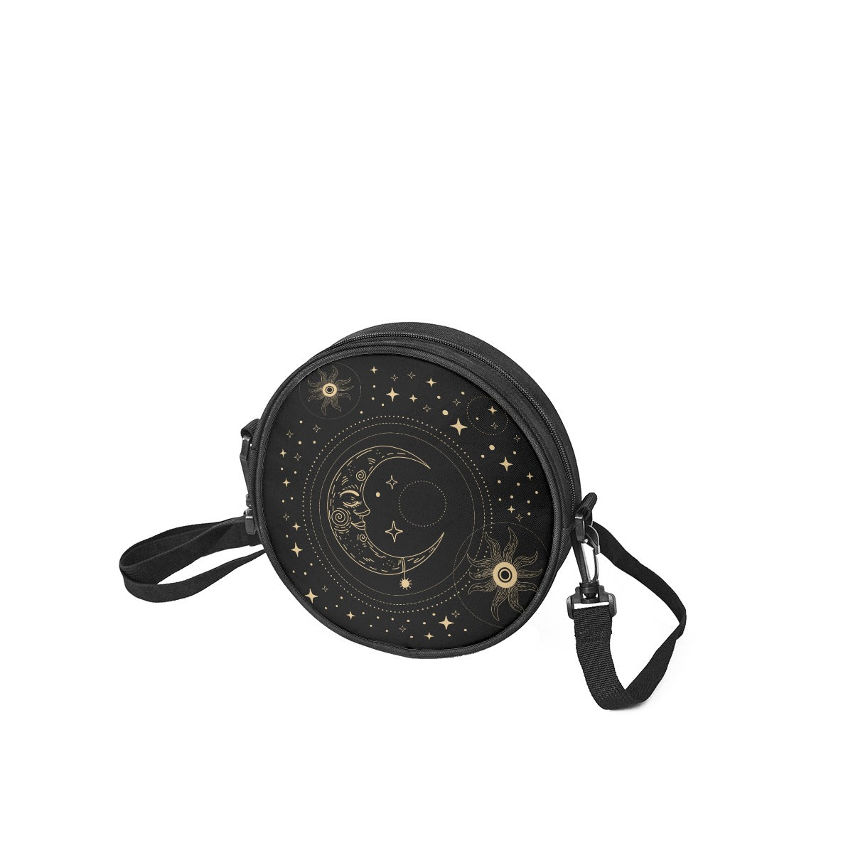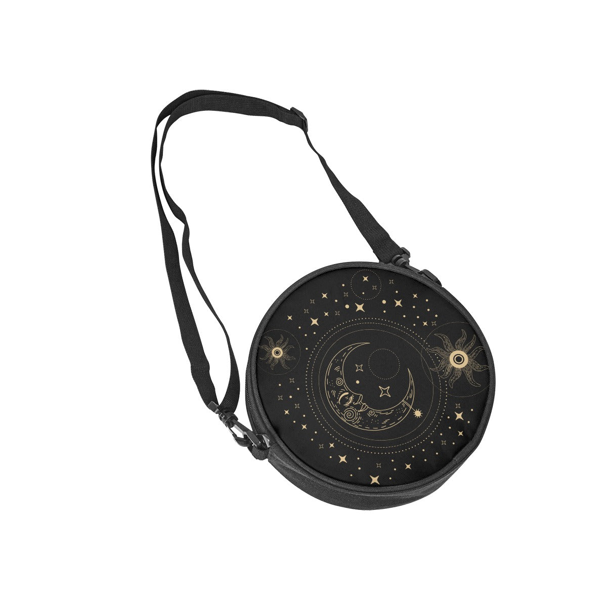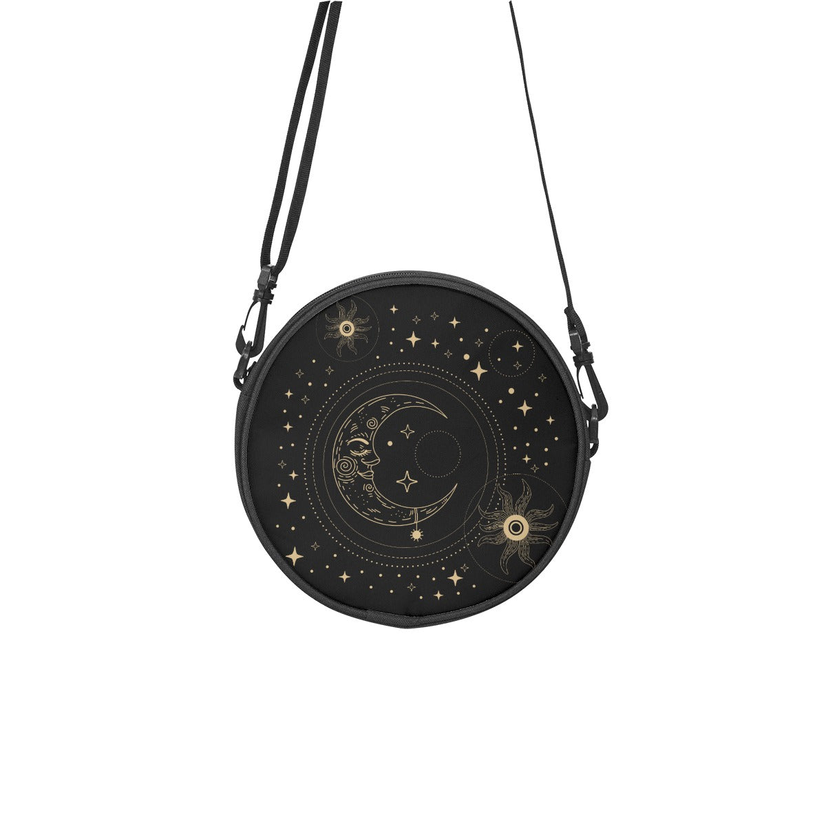 Schwarze runde Tasche mit Mond- und Sonnenmotiv im Boho-Gothic-Stil